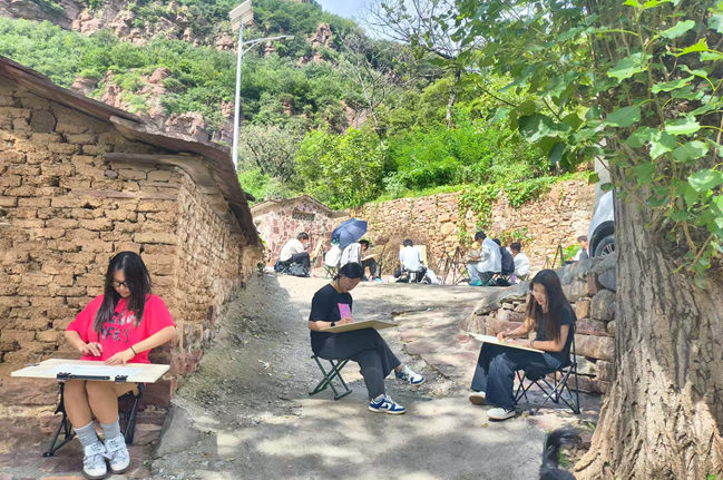 实习期间,在我院李珊珊、刘雪娇等老师的带领下,同学们对南太行山的自然景观、山区古村落和民俗建筑等进行采风写生,用画笔捕捉着光影的变幻,记录着自然之美。同学们表现出浓厚的学习热情,每日于不同地点进行写生训练,返回基地后还接受了指导教师对作品的细致点评和逐一指导。通过实践,同学们对写生中的选景、构图、上色、景深处理、明暗表达、详略取舍基础技能有了深入理解与掌握,作品在反复修改中不断完善,专业能力得到有效提升。
